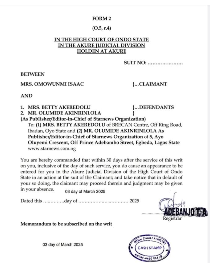 According to court documents sighted by journalists, a summons—titled Form 2 (0.5, г.4) and marked HCAK/53/CIV/2025—named Mrs. Omowumi Isaac as the claimant, with Mrs. Betty Akeredolu and Mr. Olumide Akinrinlola as the first and second defendants.
