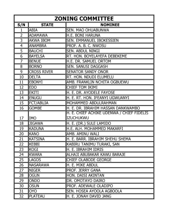 The Peoples Democratic Party (PDP) has constituted its zoning committee comprising leaders of the party from the 36 states and the Federal Capital Territory.