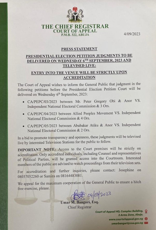 Chief Registrar, Umar Bangari, made this known in a press release on Monday as the court plans to deliver judgment on the petitions filed by Atiku Abubakar, Peter Obi, and the Allied Peoples Movement (APM).