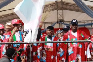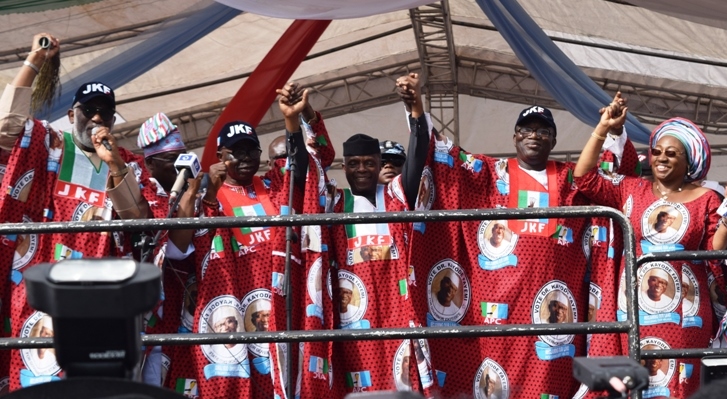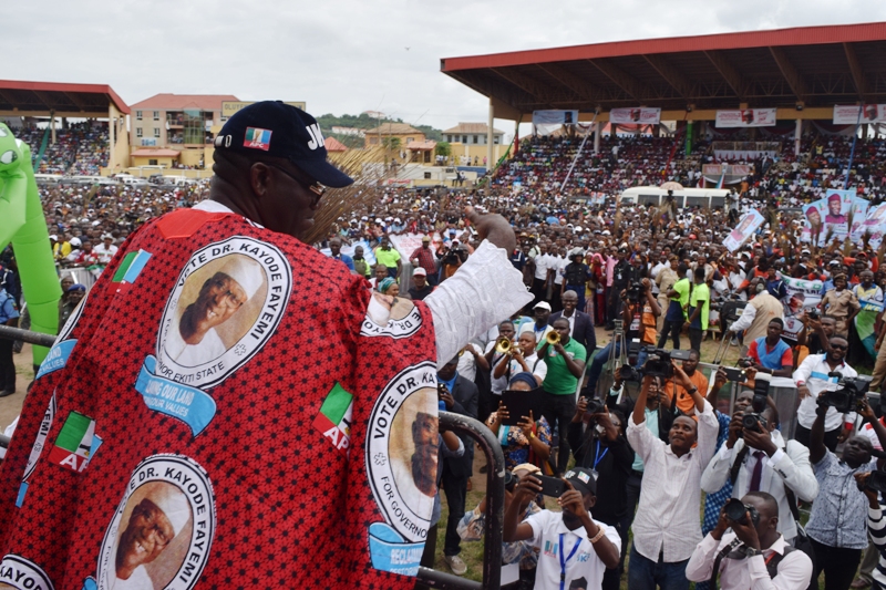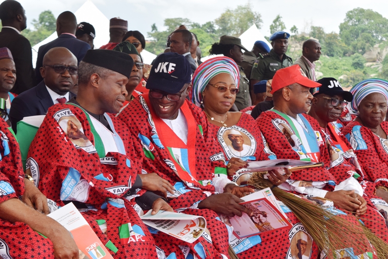 L-R: Ondo State Governor, Mr Rotimi Akeredolu (SAN); Deputy Governorship Candidate, All Progressives Congress (APC); Chief Bisi Egbeyemi; Vice President, Prof Yemi Osinbajo; APC Governorship candidate, Dr Kayode Fayemi; his wife, Erelu Bisi Fayemi at the rallyL-R: National Chairman, All Progressives Congress (APC), Chief John Odigie–Oyegiun, Osinbajo and FayemiL-R: Vice President, Prof. Yemi Osinbajo; Governorship Candidate, All Progressives Congress (APC), Ekiti State, Dr. Kayode Fayemi; his wife, Erelu Bisi Fayemi; Chairman, APC Campaign Council for Ekiti election /Kebbi State Governor, Atiku Bagudu; Deputy Governorship Candidate, Otunba Bisi Egbeyemi and his wife, Chief Mrs. EgbeyemiFayemi appreciating party supporters