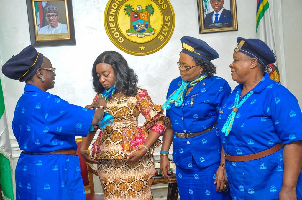 L-R: First Lady ofLagos State, Dr. (Mrs) Ibijoke Sanwo-Olu (2nd left), being decorated by the Chief Commissioner, Nigeria Girl Guides Association, Mrs. Maria-Goretti Sule (left) while the Deputy Chief Commissioner (East) and Chairman, Centenary Celebration of the Association, Dr. (Mrs) Nene Iroakasi (2nd right) and Commissioner (Lagos Chapter), Mrs. Iyabode Okuyeri, watch with admiration during the courtesy visit of the association to the Governor’s wife at Lagos House, Alausa, Ikeja