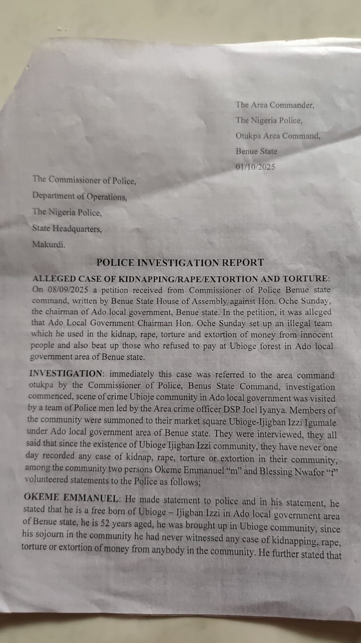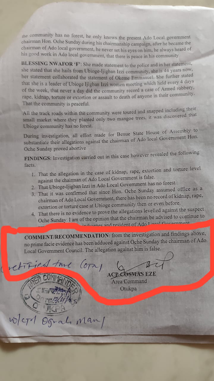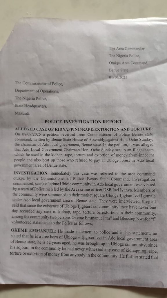 The Nigerian Police has cleared the Executive Chairman of Ado Local Government, Engineer Oche Sunday Oche, of all allegations of criminal activity levelled against him by the Deputy Speaker of the Benue State House of Assembly, Mrs. Lami Danladi Ogenyi.