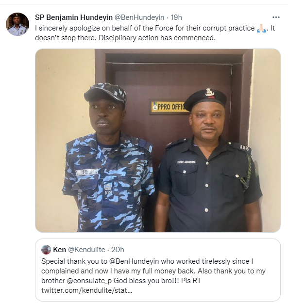 Recall that yesterday, a Twitter user, identified only as Ken, alerted the public via his Twitter handle that two officers of Nigerian police extorted N400,000 from him at Anthony area of Lagos State.