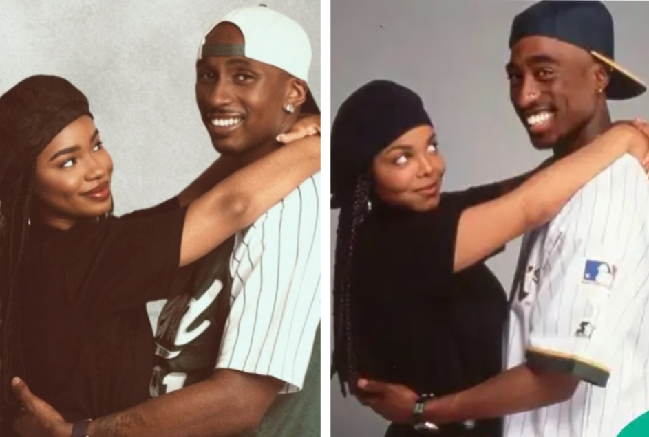 Priscilla Ojo and Juma Jux (left) reenacted 2Pac and Janet Jackson’s iconic 1993 picture (right) for their wedding anniversary. Credit: @itspriscy | Source: Instagram