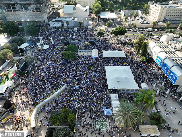 A drone view shows thousands at Hostages Square on the day Hamas returned the surviving captives taken two years ago on October 7, 2023