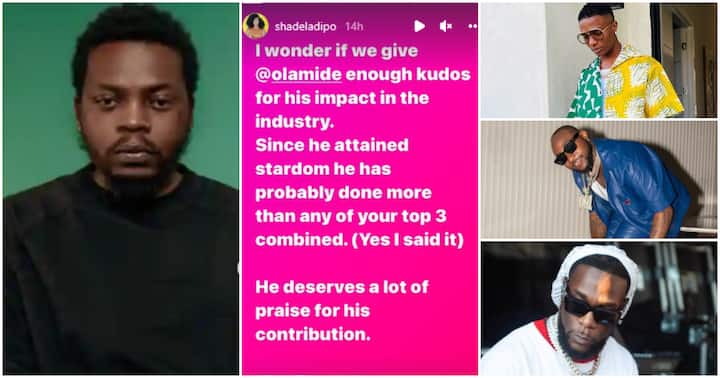 Media entrepreneur and social activist, Shade Ladipo, has taken a dig at three ace Nigerian singers, Davido, Wizkid and Burna Boy while eulogising Olamide.