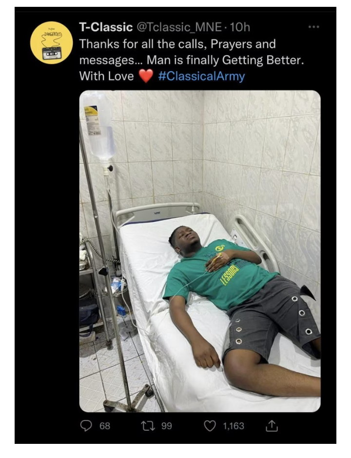 Confirming the incident on his Twitter handle, T-Classic shared a picture of him on the hospital bed receiving treatment and said that he’s getting better.