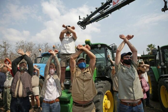 Wearing face masks and with placards plastered to their vehicles, the protesting farmers drove in a long convoy around Mookgophong, which is about 220 kilometres (135 miles) north of Johannesburg.