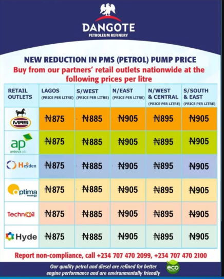 Dangote Refinery on Thursday announced a reduction of N15 across all zones, costing between N875 and N905 per litre, depending on location. It is the sixth price cut by the facility this year alone.