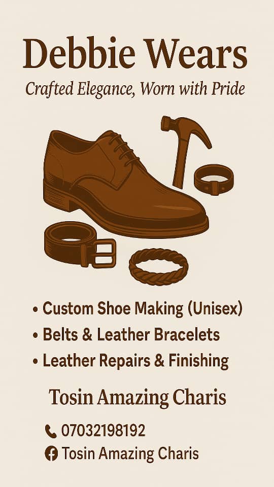 Otukoya Deborah Oluwatosin was born and raised in Lagos State. She studied Accounting at Olabisi Onabanjo University, Ago-Iwoye, Ogun State. She was trained in shoemaking at the Women Affairs and Poverty Alleviation Centre (WAPA), Isheri, under the Lagos State Government, which laid the foundation for her passion for footwear design and production.
