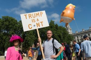 Protesters bearing different signs, reading, “Trump is a c*nt. “This is not a welcome parade,” referring to a group of demonstrators who paraded some streets in London to demand that the U.S. president leaves the U.K. immediately.