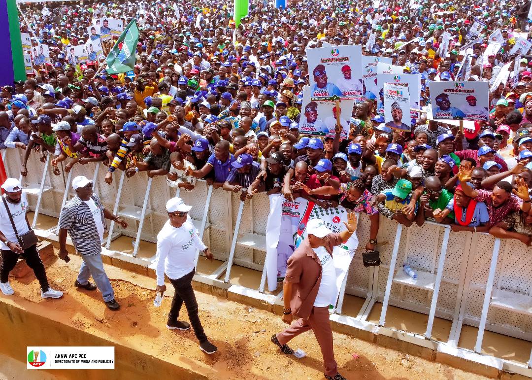 The Kashimawo Abiola Democracy Park, Oja-Oba Akure, the Ondo State capital was filled to the brim with mammoth crowd of the All Progressive Congress party members and supporters of the party’s presidential candidate, Asiwaju Ahmed Tinubu, whose campaign train was brought to the state..
