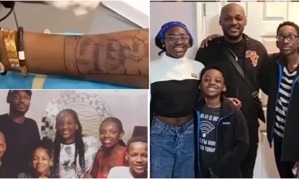 Ace singer, Tuface Idibia, who is currently spending time with his children in the United States has further demonstrated his love for them by tattooing their names on his arm.