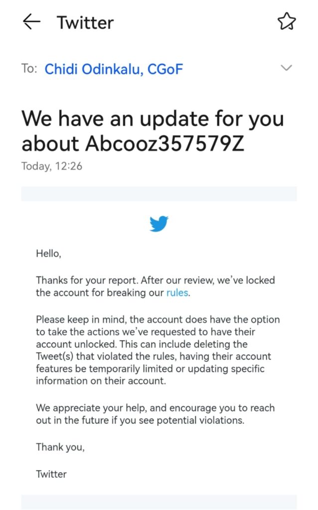 It read: ” Hello, Thanks for your report. After our review, we’ve locked the account for breaking our rules.