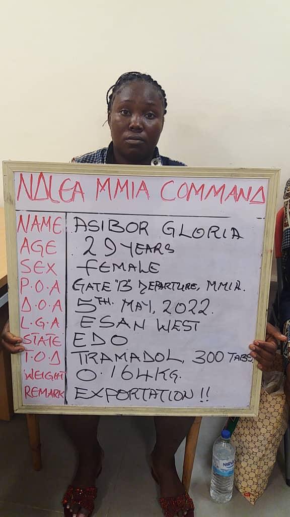 The second pregnant woman, Mrs. Gloria Asibor was arrested on Thursday, May 5, while attempting to board a Turkish Airline flight to Bolonia, Spain via Istanbul, Turkey. A search of her luggage containing food items led to the discovery of 300 tablets of 200mg and 225mg high dosage Tramadol concealed in crayfish.