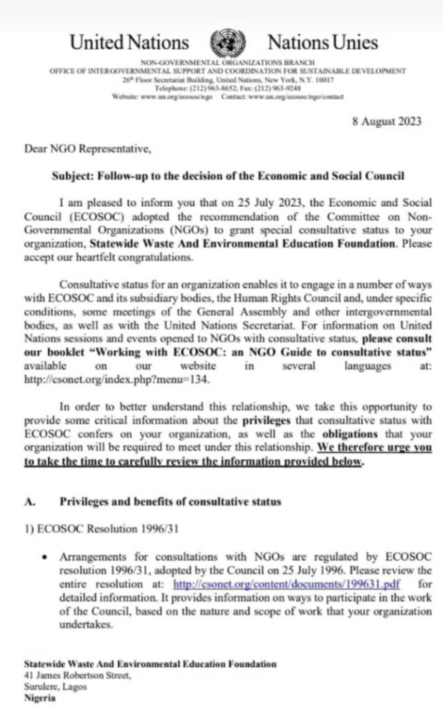On receiving the letter that conveyed the message, Amb. Obuesi and others members became estatic and jubilant and promised to latch on UN recognition to ensure improved ways of waste removal to achieve cleaner environment in Cities, University campuses and in communities in Nigeria.