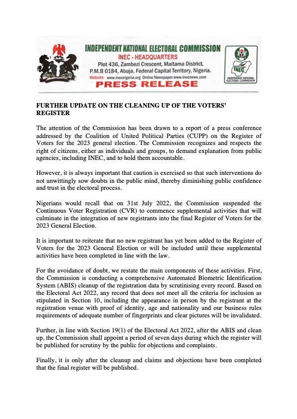 “The attention of the Commission has been drawn to a report of a press conference addressed by the Coalition of United Political Parties (CUPP) on the Register of Voters for the 2023 general election. The Commission recognizes and respects the right of citizens, either as individuals or groups, to demand explanation from public agencies, including INEC, and to hold them accountable.