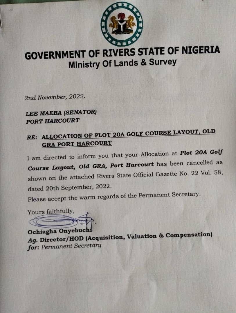 The letter read, “I am directed to inform you that your allocation at Plot 20A Golf Course Layout, Old GRA, Port Harcourt has been cancelled as shown on the attached Rivers State Official Gazette No. 22 Vol. 58, dated 20th September, 2022. Please accept the warm regards of the Permanent Secretary.”