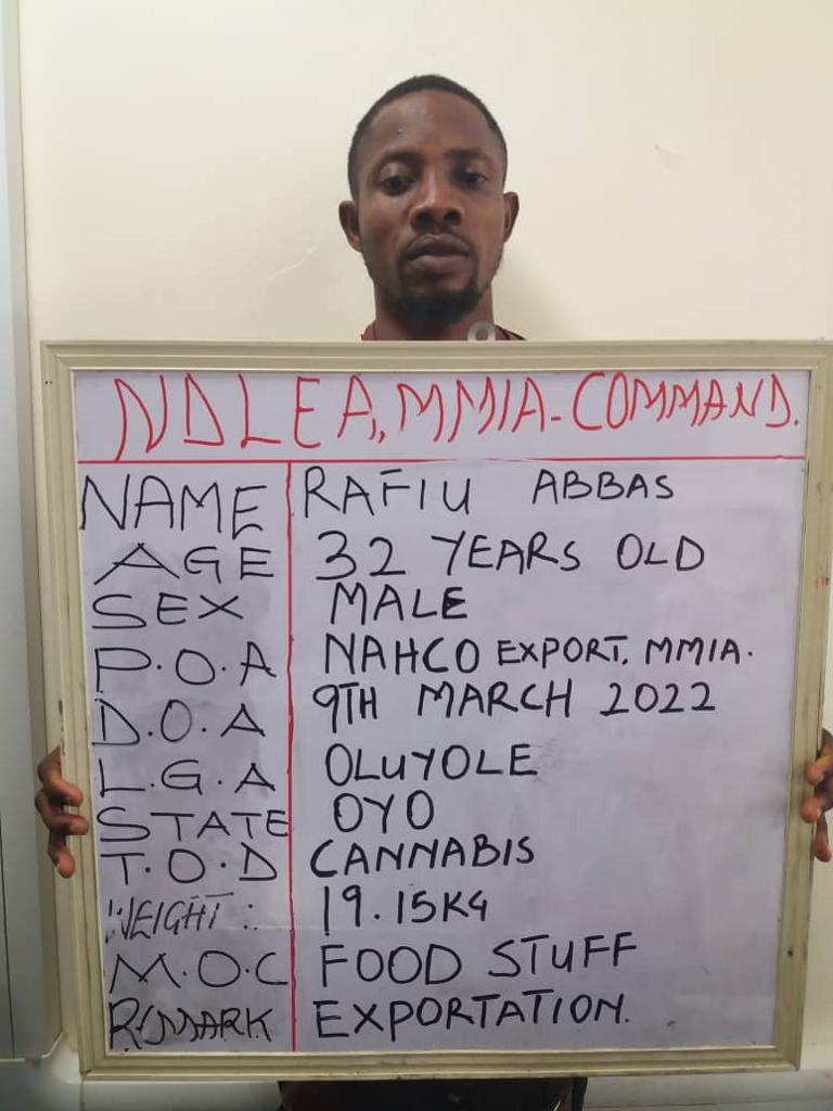 Also on the same day, operatives arrested a freight agent, Rafiu Abbas at the NAHCO Export Shed of the airport when he presented a cargo containing 19.15kg cannabis going to London. The illicit substance was concealed inside plastic containers labelled as “African Dishes” and packed in a bag.
