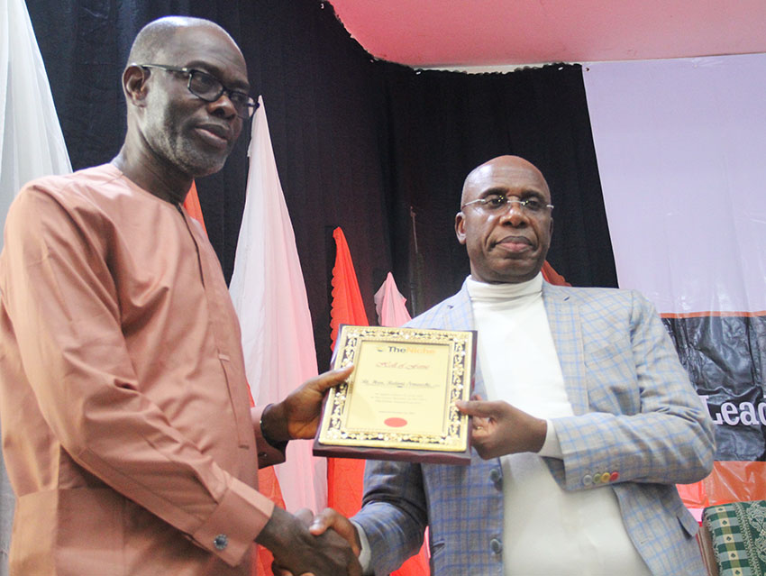 Ikechukwu Amaechi presenting a plaque to Rotimi Amaechi after his induction into TheNiche Hall of Fame, an honour reserved for Chairpersons and Guest Speakers at TheNiche Annual Lecture